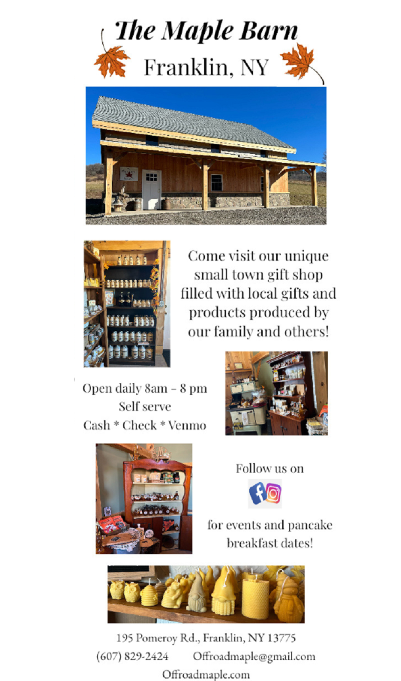 Off Road Maple, LLC is a family owned producer of wood-fired maple syrup, value added maple products and honey. The Maple Barn is our gift shop and is open daily 8am-8 pm where we have all of our products, our angus beef, and many products from other local families. Need some products shipped? Visit our website offroadmaple.com and find us on Facebook for event postings. Gift boxes available, call us to customize 607-829-2424.